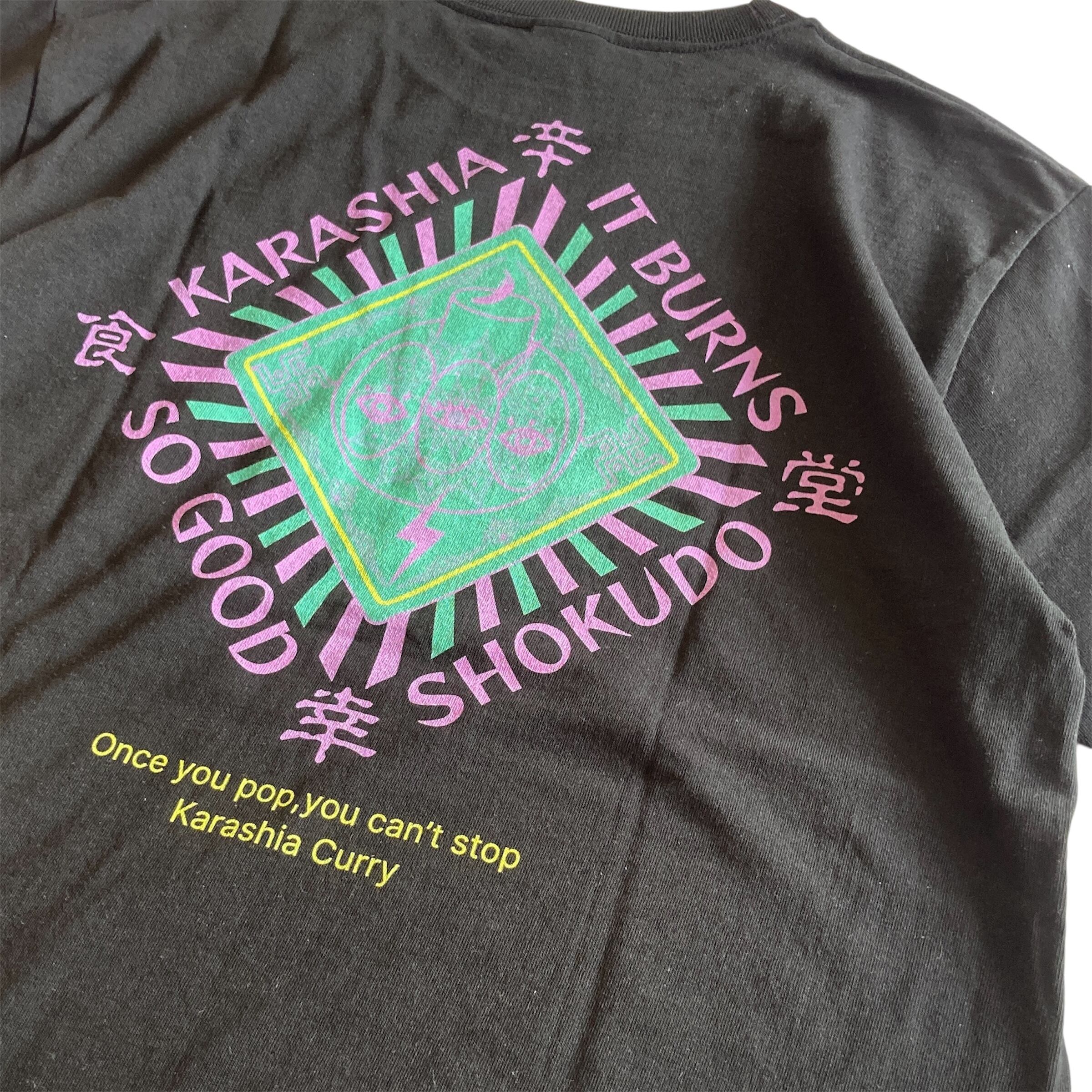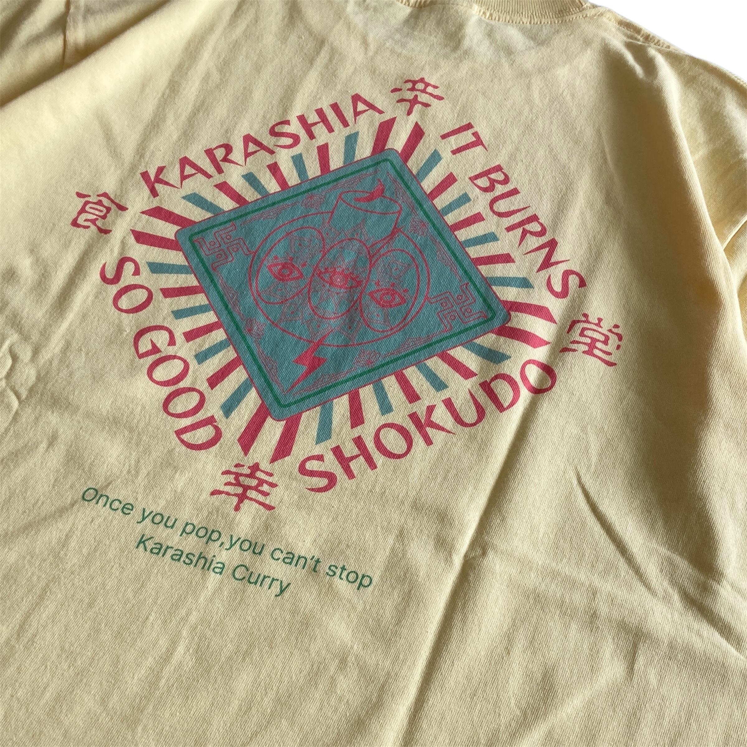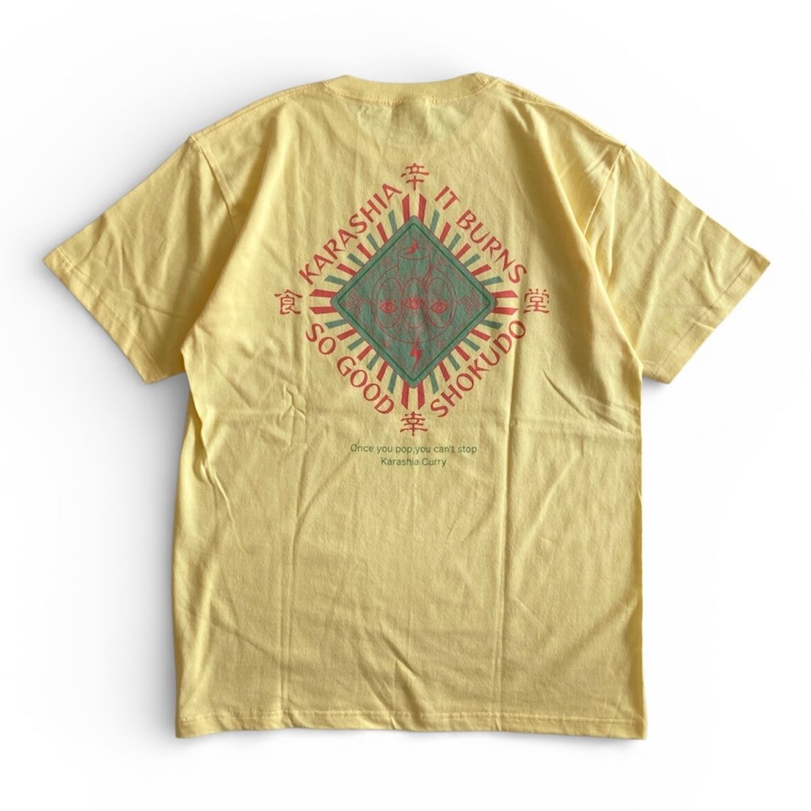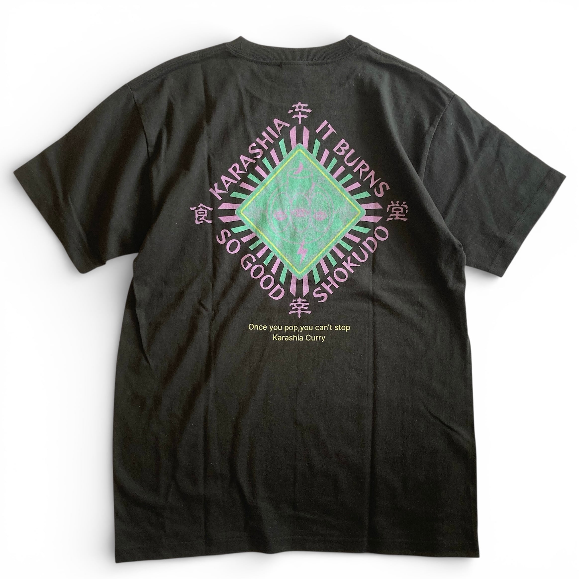 フロントプリントには『やめられない止まらない』のフレーズ。バックプリントはフリーメイソン風にアレンジしたカラシアくん。