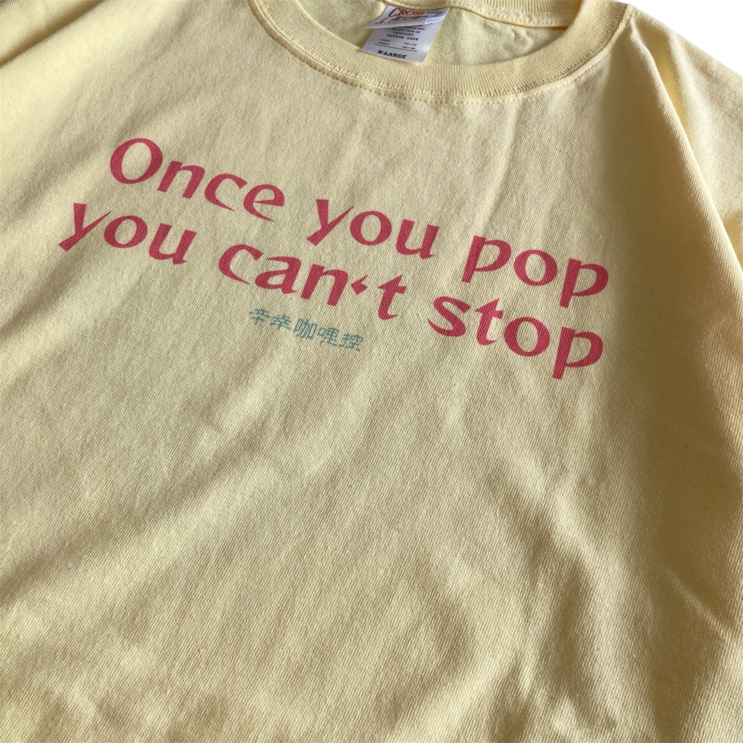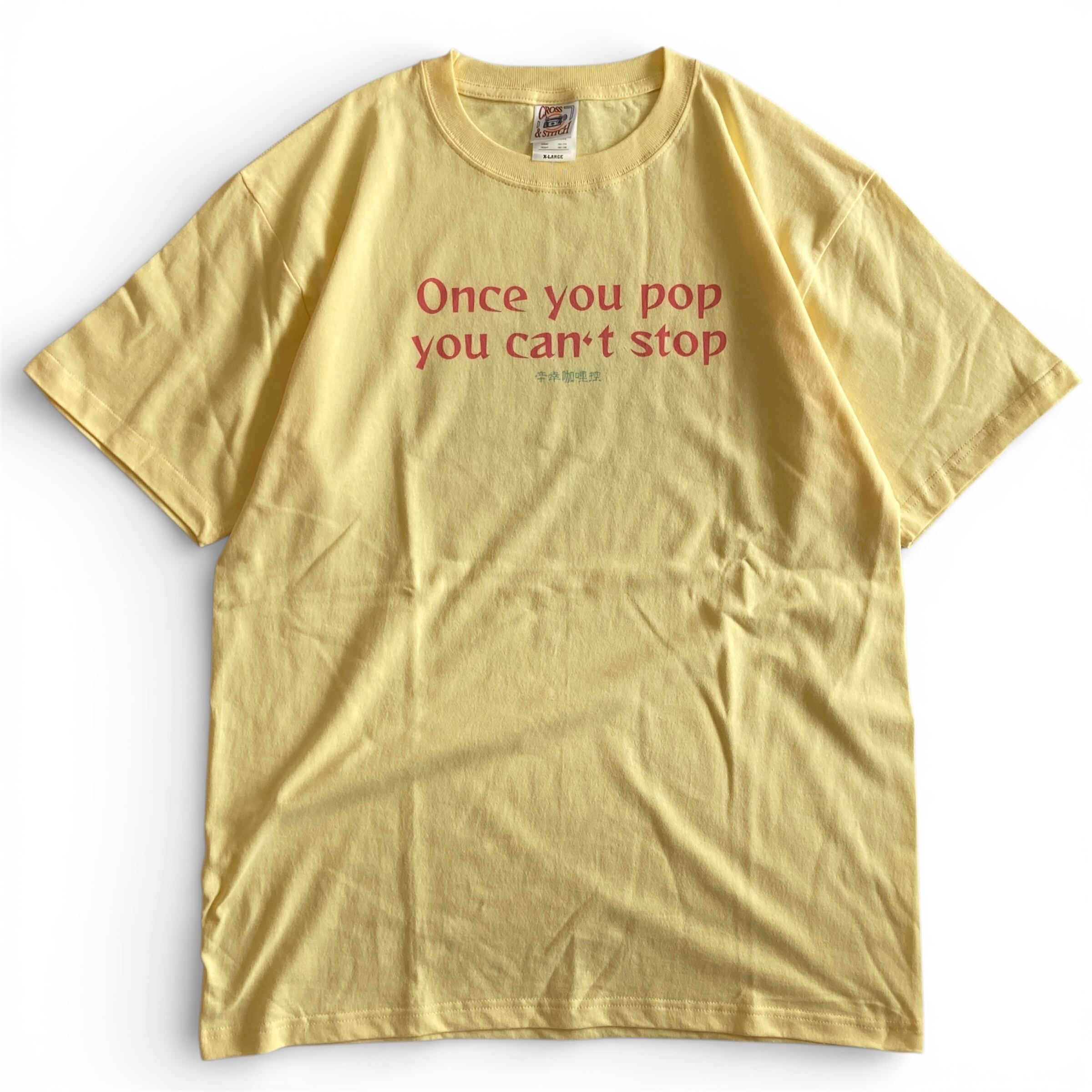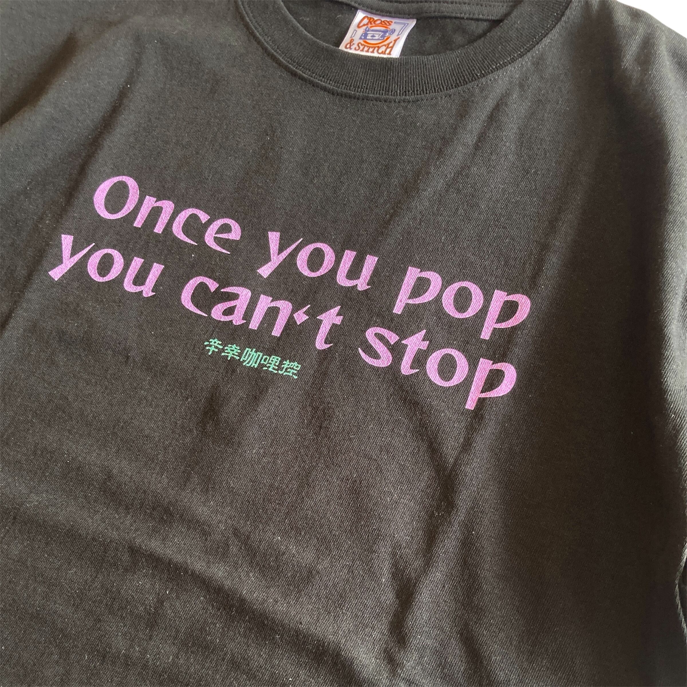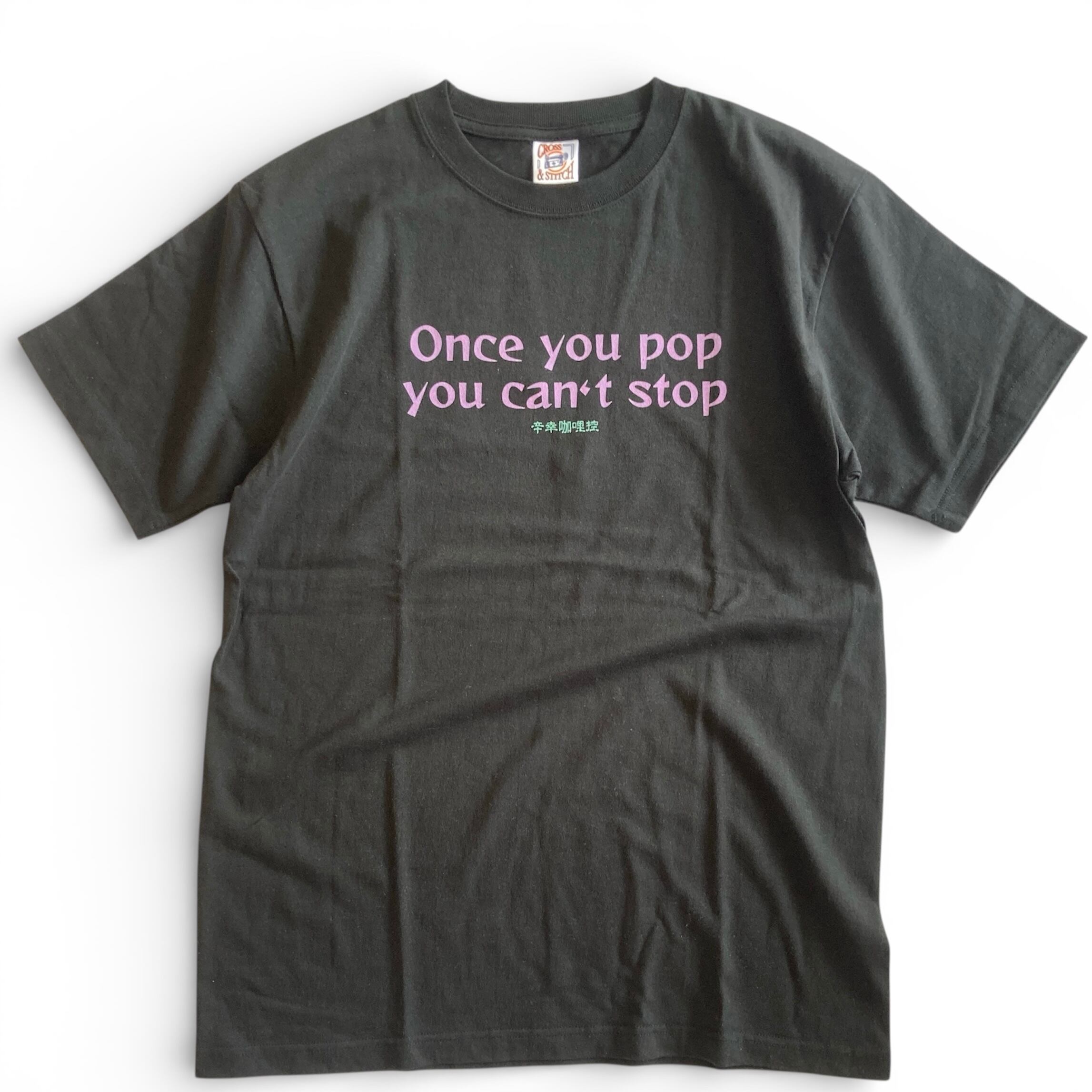 フロントプリントには『やめられない止まらない』のフレーズ。バックプリントはフリーメイソン風にアレンジしたカラシアくん。